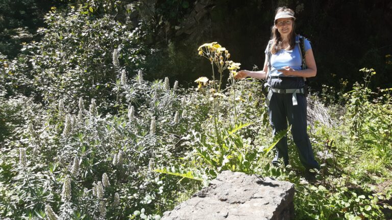 Met La Caldera als startpunt gewandeld over smalle paadjes langs, soms diepe, dichtbegroeide kloven. Route 7 uit Rother Wandelgidsen Tenerife (uitg Elmar) en een gedeelte etappe 20 van de GR. Jacqueline is IVNgids en ontdekt het ene bijzondere plantje na…
