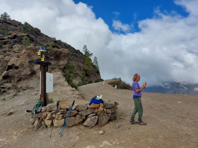 Hostal Finca La Isa ligt hoog, prachtige locatie met uitzicht op Roque Nublo, relaxte huiskamer/eetzaal, wees niet te kritisch op sanitair en er worden voortreffelijke (vegetarische) maaltijden en ontbijten geserveerd. Gisterochtend stonden we op met strakblauwe hemel, vanmorgen stormt het…