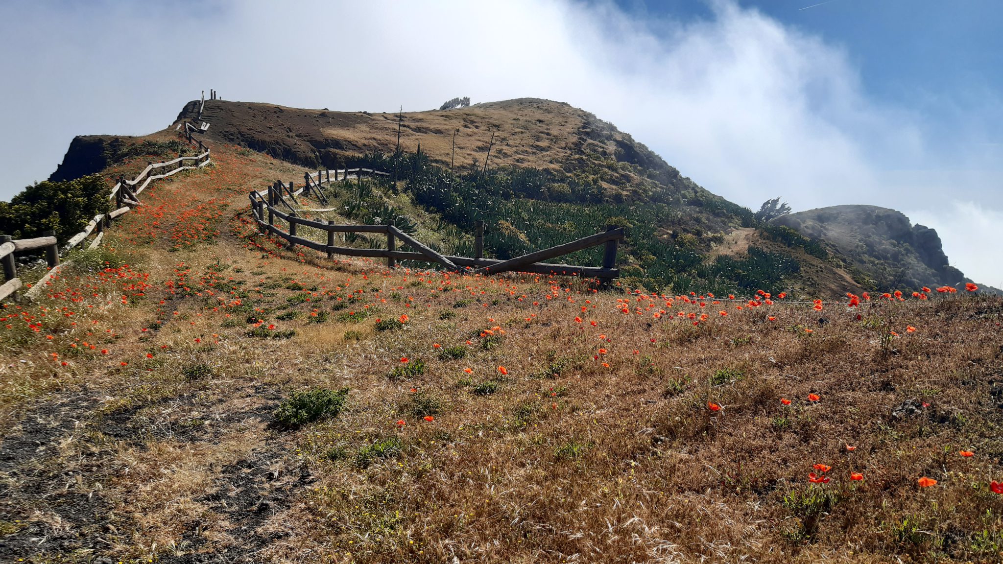 Ik passeer een kruis en een tegel aan de muur die meldt dat hier de Camino de la Virgin begint, de pelgrimsroute van El Hierro. Het pad is vrij breed en goed begaanbaar en omzoomd door klaprozen (op de andere eilanden nauwelijks gezien). Op een gegeven moment zien hele hellingen rood. Ik denk aan mijn moeder . Zij hield veel van deze bloemen.